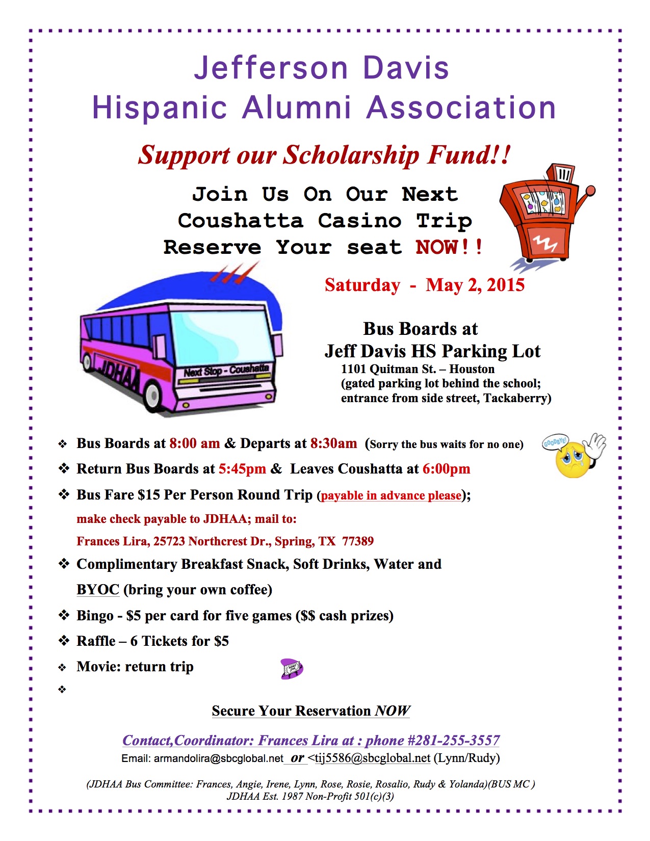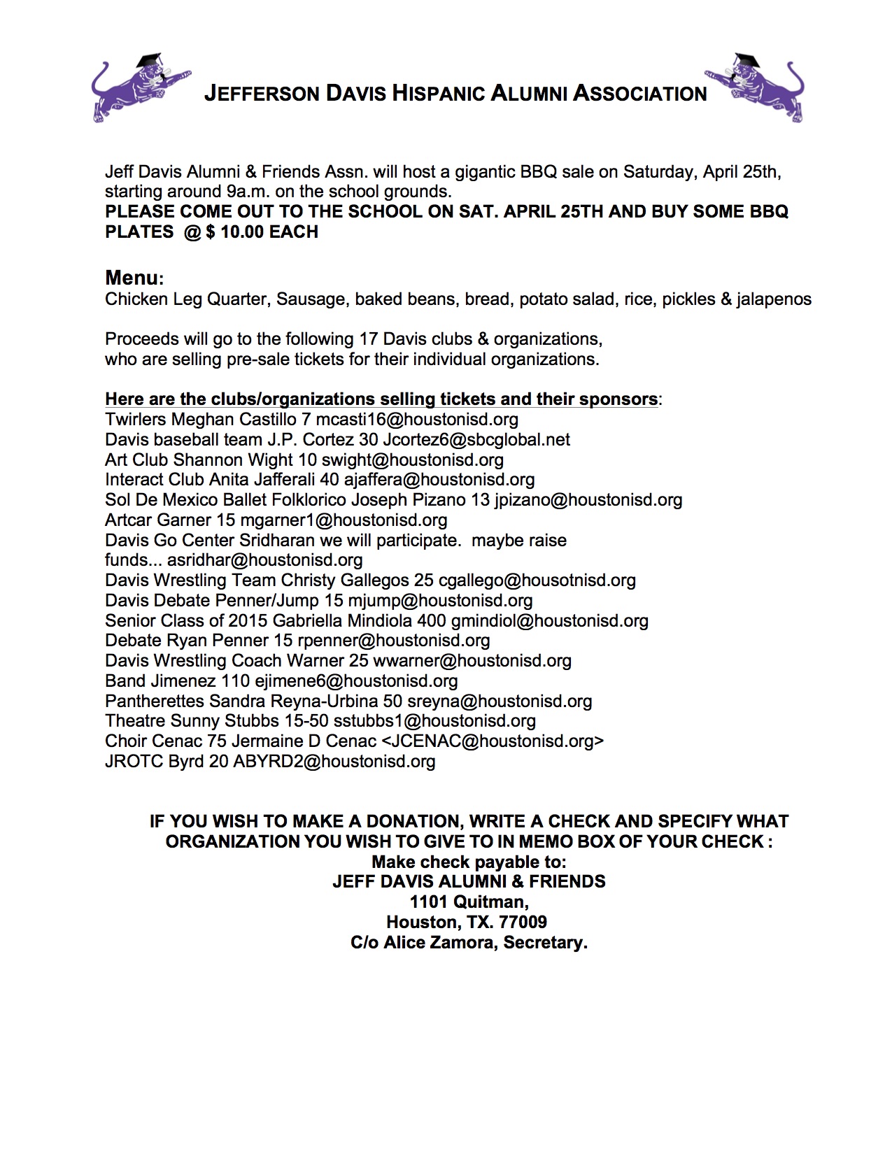 To Geneva Green – 832-758-6475 or via email: gtgreen1@comcast.net